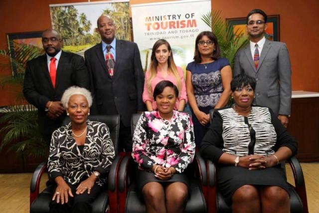 (Seated at centre) The Honourable Shamfa Cudjoe, Minister of Tourism, is flanked by Directors Dennise Demming, Chairman (at left), and Frederica Brooks-Adams. Standing (from left) are TDC Directors Davlin Thomas, Eric Taylor, Tonya Laing, Sherry Katwaroo-Ragbir and Dennis Sammy.